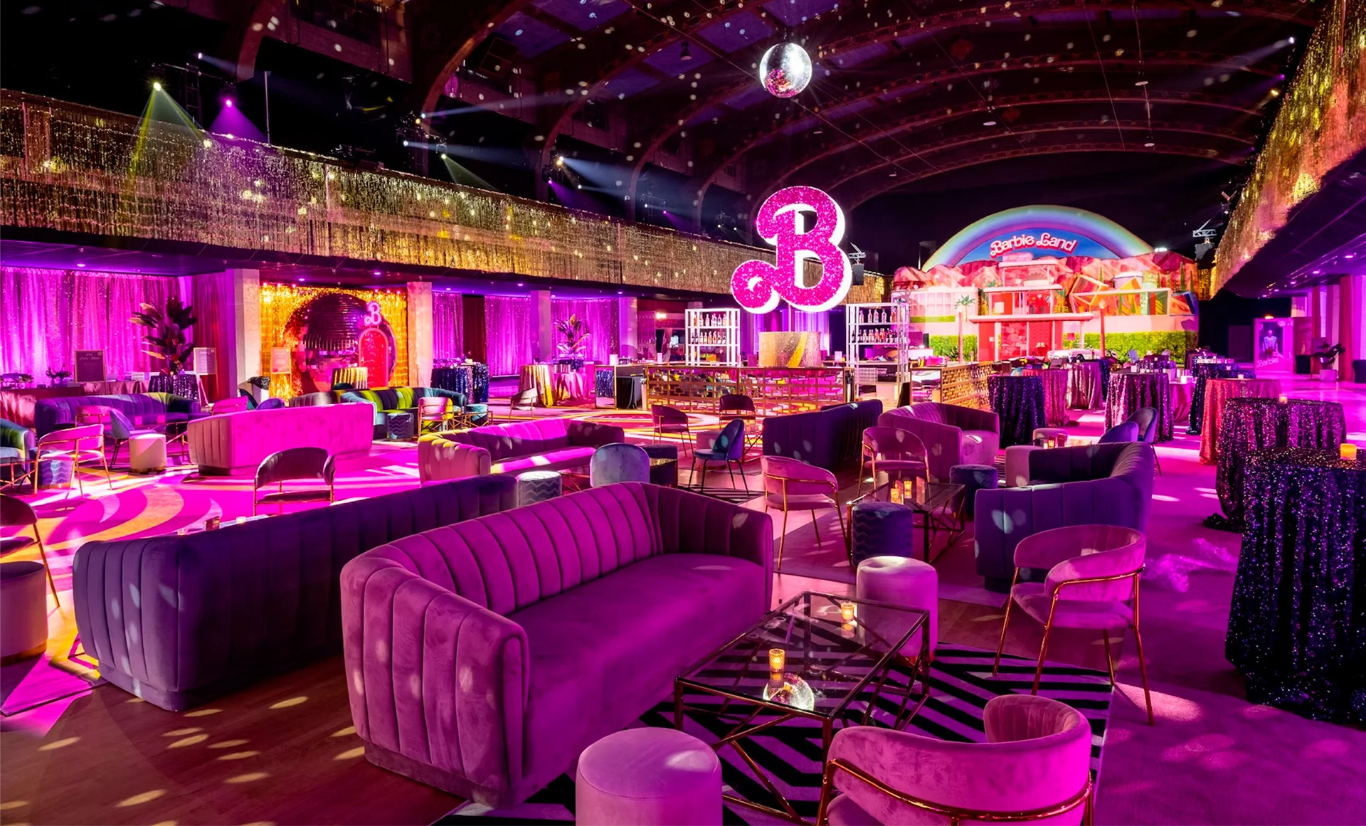 Inspired by the disco party in Greta Gerwig’s film, Barbie, Mattel partnered with Mirrored Media to create a larger-than-life 12' pink disco ball for the Los Angeles movie premiere event at the Shrine Auditorium. Guests entered the large disco ball and found themselves transported into Barbie Land surrounded by gold and silver streamers and over a dozen pink disco balls. A replica of the Barbie DreamHouse set with vignettes featuring the Barbie The Movie doll collection, her iconic Corvette, and a custom Barbie disco ball logo were displayed inside.