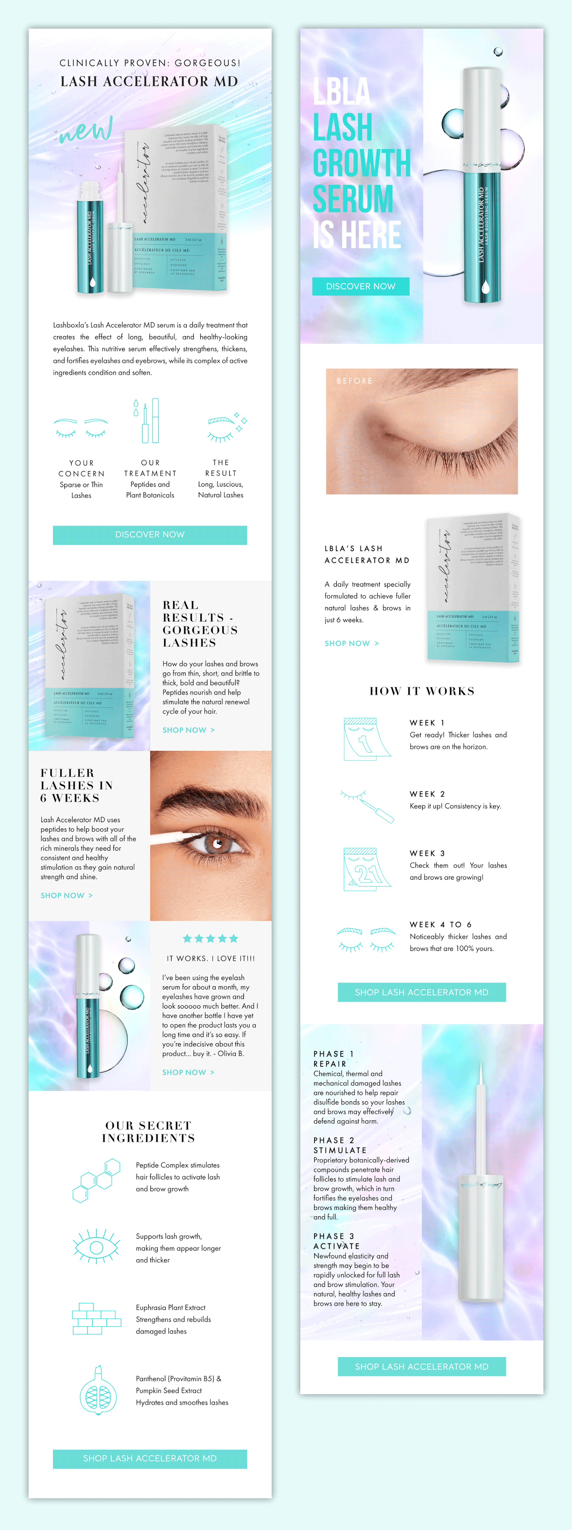 LashBox LA is a Los Angeles based, premium B2B retailer, providing high-quality eyelash extension products exclusively for industry professionals. I led the art direction and visual identity for LBLA’s Lash Accelerator MD Serum launch, the brand’s high-performance treatment designed to promote longer, stronger lashes, across a full 360° digital campaign. I set the overall look and feel – including tone, color palette, and mood – to ensure brand consistency and create a sleek, professional aesthetic. We developed a suite of digital assets, including social content, e‑blasts, web banners, and a responsive desktop/mobile landing page.